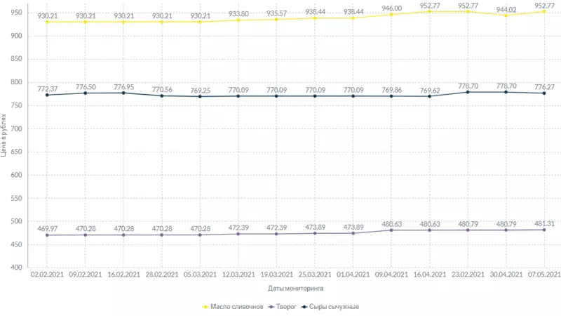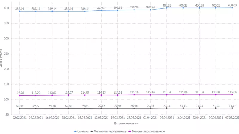Стоимость сметаны выросла на 32 копейки, а творог за неделю подорожал на 52 копейки. Средняя цена сыра снизилась — разница с прошлой неделей составляет 2 рубля и 43 копейки.