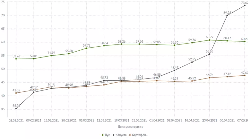 В ассортименте наиболее востребованных овощей немного увеличилась цена за килограмм картофеля — на 48 копеек. Белокочанная капуста подорожала на 3 рубля и 69 копеек, а репчатый лук подешевел на 27 копеек за это же время. За килограмм моркови продавцы запрашивают на 1 рубль и 86 копеек больше, чем неделю назад.