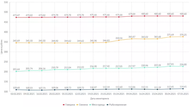 За килограмм говядины, как и на прошлой неделе, просят 480 рублей и 60 копеек. Свинина подорожала за это же время на 56 копеек, а курица подешевела на 93 копейки. Свежемороженая неразделанная рыба выросла в цене на 96 копеек.