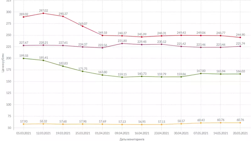 В ассортименте популярных овощей также наблюдается динамика цен. Картофель подорожал на 10 копеек за неделю, а белокочанная капуста — на 1 рубль. Репчатый лук вырос в цене на 1 рубль и 57 копеек, а морковь стоит, как и раньше, 60 рублей и 76 копеек за килограмм.