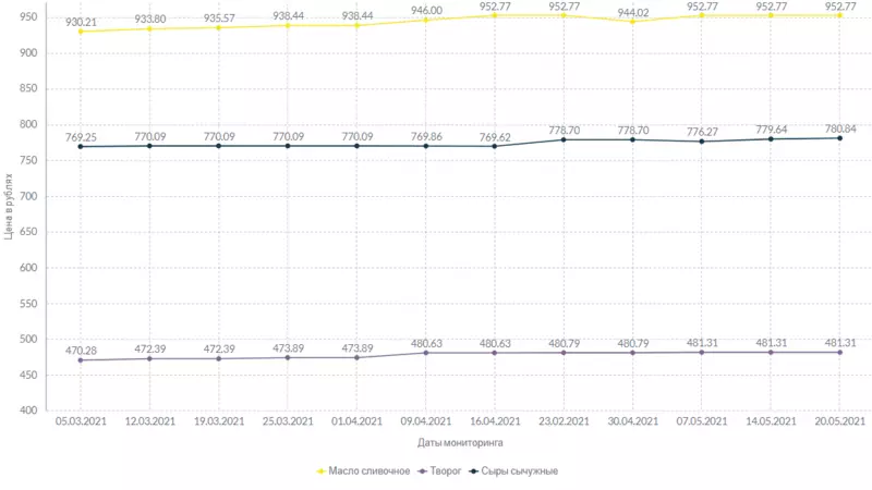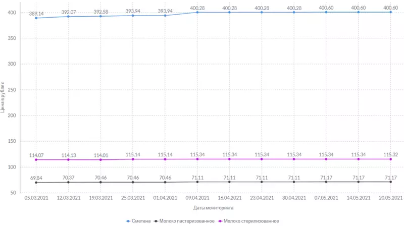 За килограмм сметаны, как и на прошлой неделе, запрашивают 400 рублей и 60 копеек. Творог обойдется в 481 рубль и 31 копейку за килограмм. Сыры подорожали на 1 рубль и 20 копеек.