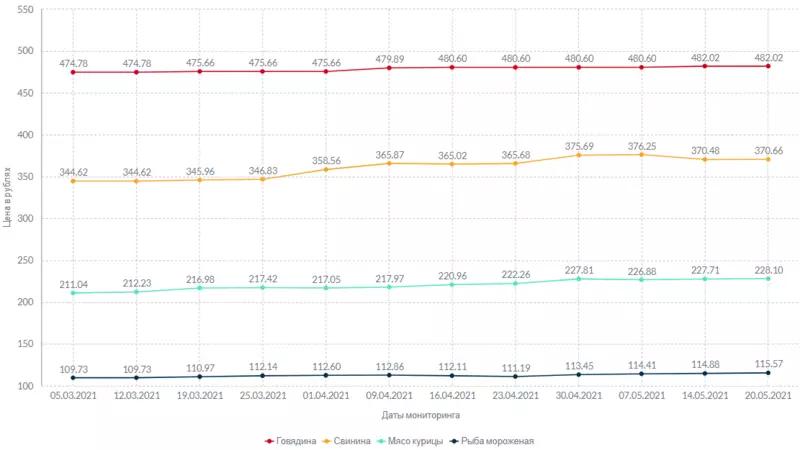 Стоимость килограмма говядины осталась неизменной с прошлой недели — 482 рубля и 2 копейки. Свинина подорожала на 18 копеек за это же время, а курица — на 39 копеек. Мороженая неразделанная рыба выросла в цене на 69 копеек за неделю.
