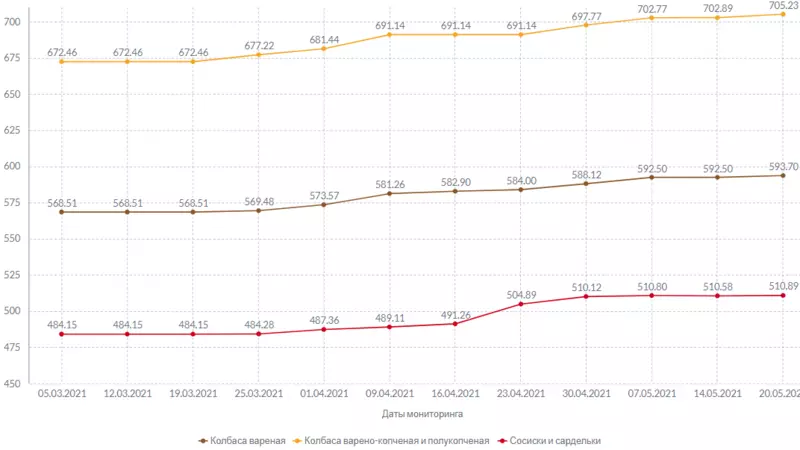 На рынке мясных деликатесов подорожали все основные позиции. За килограмм вареной колбасы запрашивают на 1 рубль и 20 копеек больше, цена на сосиски и сардельки подросла на 31 копейку, а полукопченая и варено-копченая колбаса обойдется на 2 рубля 34 копейки дороже.