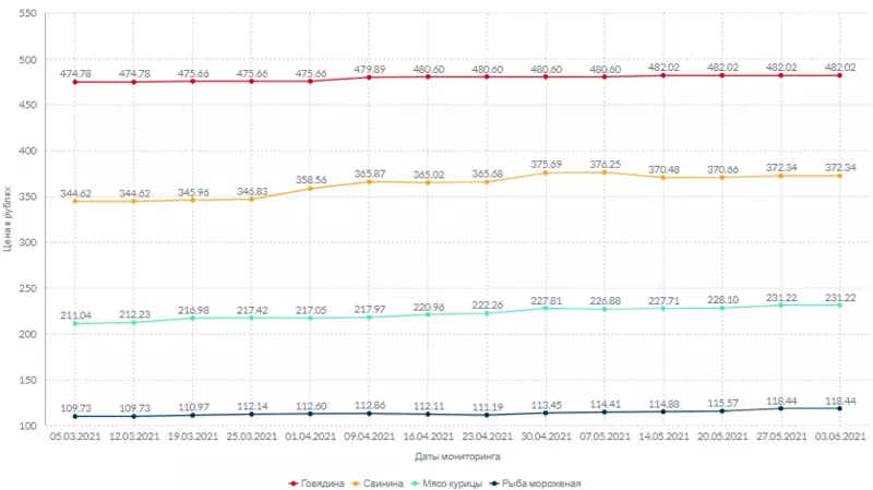 Стоимость килограмма говядины в сравнении с предыдущей недели осталась неизменной: продавцы запрашивают 482 рубля и 2 копейки за единицу веса. Цены на свинину также стабильны — 372 рубля и 34 копейки за килограмм. Курицу отдают за 231 рубль и 22 копейки, а мороженую неразделанную рыбу — за 118 рублей и 44 копейки.