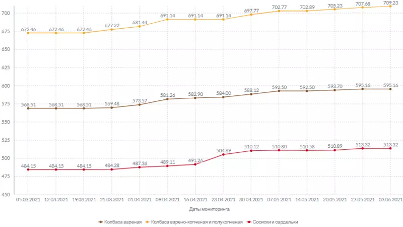 Стоимость сосисок и сарделек, как и на прошлой неделе, составила 513 рублей 32 копейки за килограмм. Полукопченая и варено-копченая колбаса подорожала на 1 рубль и 55 копеек, а килограмм вареной обойдется покупателям в 595 рублей и 16 копеек.