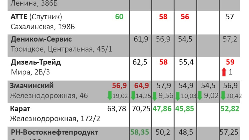 По данным авторов канала, сильнее всего изменились цены на бензин на АЗС "Змачинский". Неделю назад в СМИ появилась информация о том, что на стенде возле заправки указаны цены за 0,71 литра. Тогда владельцы АЗС объяснили это рекламным ходом. Однако на этой неделе стало известно, что комплекс вернулся к стандартным расчетам за 1 литр, не меняя стоимости на стенде. Так что и цены упали значительно: АИ-98 по сравнению с прошлой неделей на этой заправке стал стоить на 14,2 рубля дешевле, керосин упал в цене на 19 рублей, а дизтопливо — на 20,4 рубля. Оперативно дозвониться до АЗС, чтобы уточнить причины такого решения, РИА "Сахалин-Курилы" не удалось.
