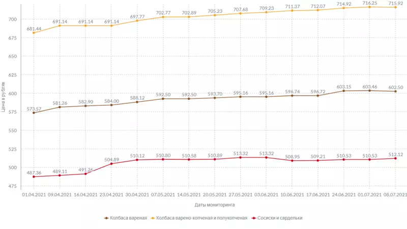В ассортименте наиболее востребованных колбасных изделий увеличилась стоимость сосисок и сарделек. Прибавка за неделю составила 1 рубль и 59 копеек. Вареная колбаса подешевела на 96 копеек, а полукопченая и варено-копченая — на 33 копейки.