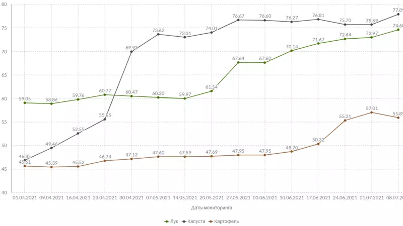 В овощных рядах подешевел картофель. Стоимость килограмма клубней снизилась на 1 рубль и 12 копеек. Капуста за неделю подорожала на 2 рубля и 20 копеек, а репчатый лук — на 1 рубль и 63 копейки. Стоимость килограмма моркови выросла на 20 копеек.