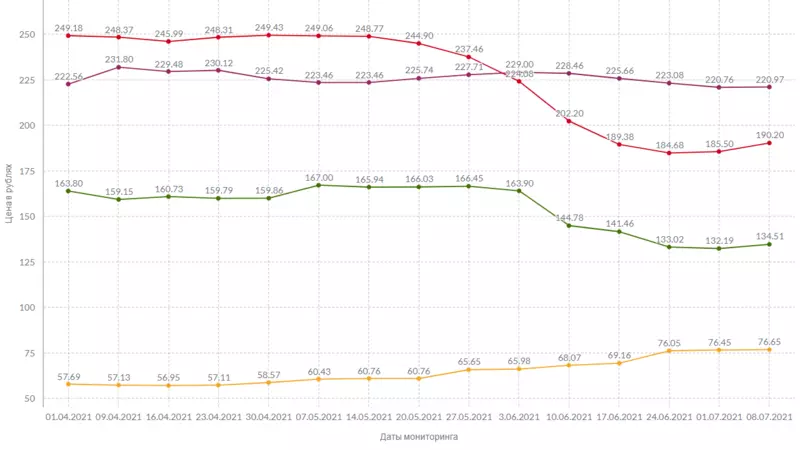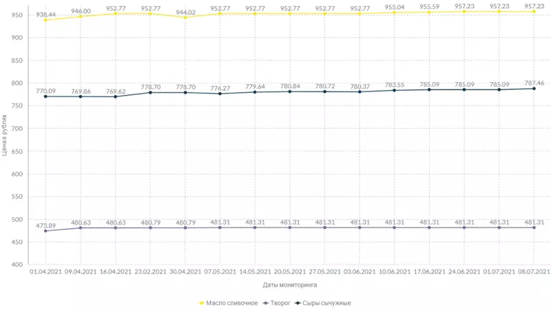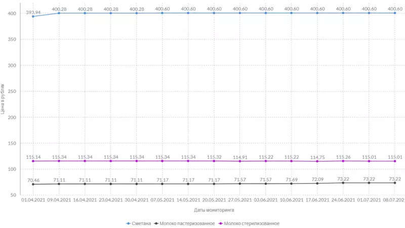 За килограмм сметаны запрашивают 400 рублей и 60 копеек. Творог стоит, как и неделю назад, 481 рубль и 31 копейку за единицу массы. Сыры подорожали в среднем на 2 рубля и 37 копеек.