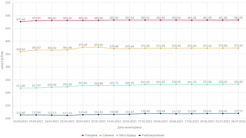 Говядина в первую неделю июля подорожала на 19 копеек. За килограмм свинины продавцы запрашивают на 7 копеек больше, чем в конце прошлого месяца, а курица выросла в цене на 56 копеек. Мороженая неразделанная рыба подорожала за это же время на 70 копеек.