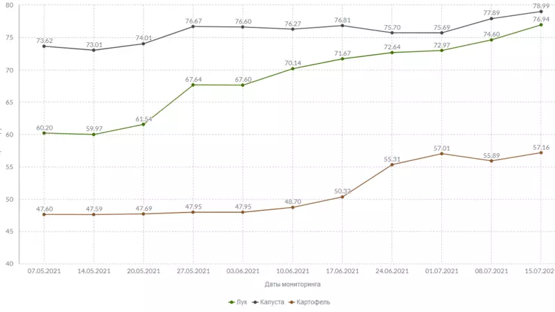В овощных рядах снова подорожал картофель: прибавка к стоимости прошлой недели составила 1 рубль и 27 копеек. Белокочанная капуста выросла в цене на 1 рубль и 10 копеек за это же время, а репчатый лук — на 2 рубля и 34 копейки.