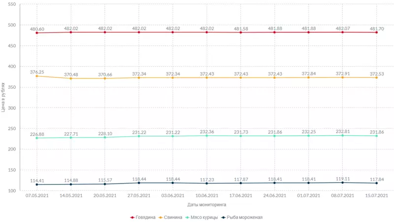 Стоимость говядины в сравнении с предыдущей неделей снизилась на 37 копеек. Подешевела и свинина: за единицу массы продавцы запрашивают на 38 копеек меньше. Охлажденная и мороженая курица подешевела на 95 копеек, а рыба — на 1 рубль и 27 копеек.