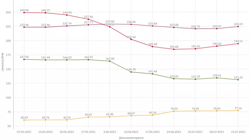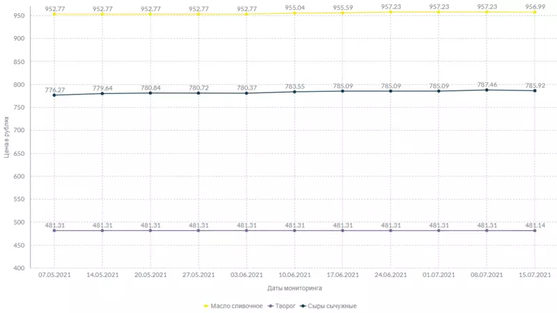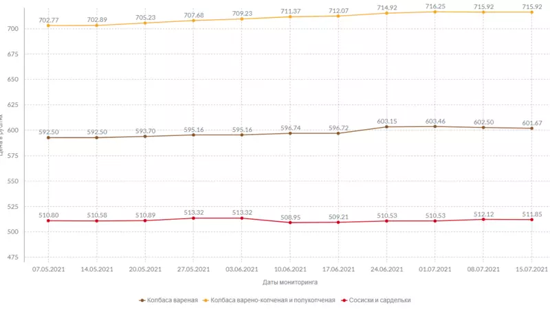 В ассортименте колбасных изделий подешевели сосиски и сардельки — разница с прошлой неделей составляет 27 копеек. Ценник на вареную колбасу снизился на 83 копейки, а полукопченая и варено-копченая колбаса, как и на прошлой неделе, стоит 715 рублей и 92 копейки.