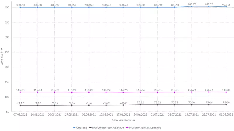 Сметана подешевела на 1 рубль и 56 копеек за минувшую неделю. За килограмм творога просят 481 рубль и 62 копейки, а сыр подорожал на 1 рубль и 85 копеек за отчетный период.