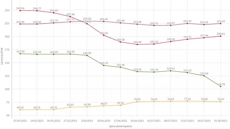 Огурцы за последнюю неделю июля подешевели на 20 рублей и 31 копейку. Помидоры выросли в цене на 2 рубля и 95 копеек за это же время. Яблоки подорожали на 2 рубля и 1 копейку.