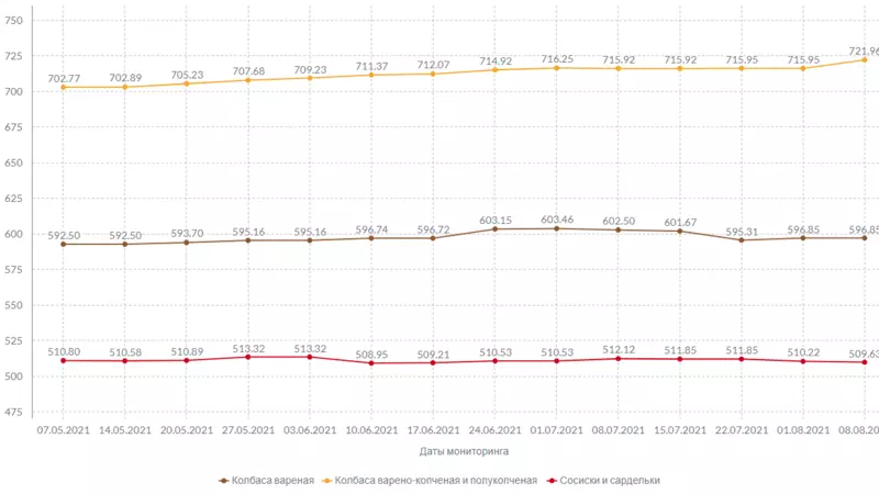 Сосиски и сардельки подешевели в первые дни августа на 49 копеек. Стоимость вареной колбасы осталась без изменений — 596 рублей и 85 копеек за кило. За единицу массы полукопченой и варено-копченой колбасы продавцы запросят на 6 рублей и 1 копейку больше.