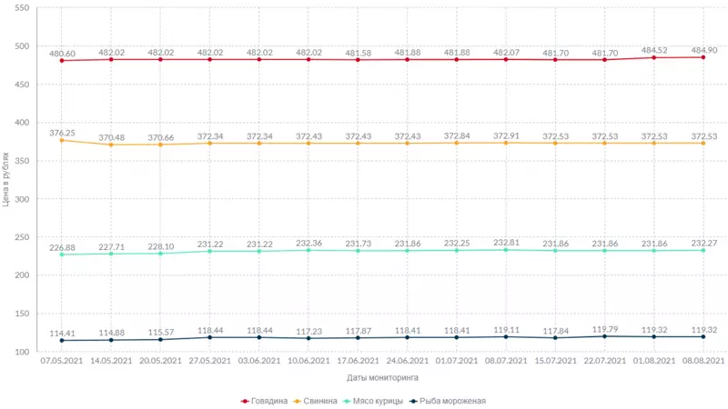 Стоимость говядины по итогам первой недели августа выросла на 38 копеек. Свинина не подорожала: за единицу массы запрашивают 372 рубля и 53 копейки. Прибавка к цене куриного мяса составляет 41 копейку, а мороженая неразделанная рыба стоит, как и на прошлой неделе, 119 рублей и 32 копейки за килограмм.
