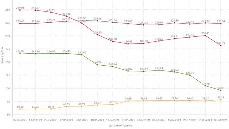 Свежие яблоки в начале августа подешевели на 1 рубль и 39 копеек. Стоимость огурцов снизилась на 8 рублей и 48 копеек. Уменьшился и средний ценник на килограмм свежих томатов: за неделю стоимость весовой единицы помидоров снизилась на 19 рублей и 13 копеек.