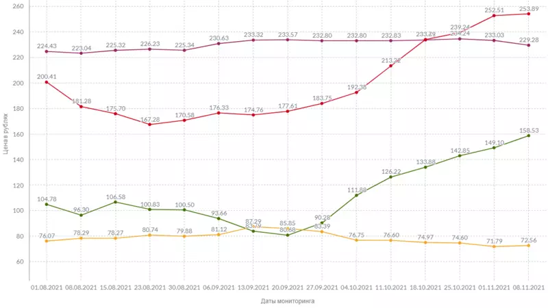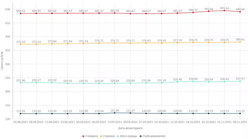 Стоимость килограмма говядины в первые дни ноября снизилась на 4 рубля и 51 копейку. Свинина за это же время подорожала на 1 рубль и 86 копеек, а мясо курицы — на 1 рубль и 5 копеек. Свежемороженую неразделанную рыбу отпускают по той же цене, что и в конце октября — 119 рублей и 72 копейки за килограмм продукции.