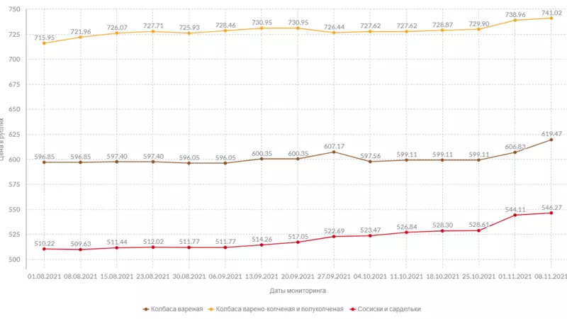 В ассортименте колбасных изделий подорожали все основные товары. Вареная колбаса «прибавила» в среднем 12 рублей и 64 копейки. Сосиски и сардельки выросли в цене на 2 рубля и 16 копеек. Полукопченая и варено-копченая колбаса подорожала на 2 рубля и 6 копеек за прошедшую неделю.