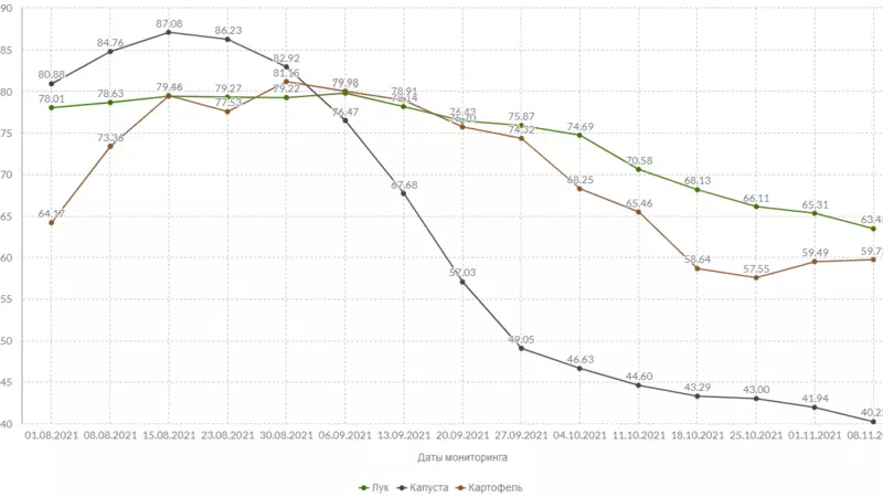 В овощных рядах немного подорожал картофель: прибавка к стоимости килограмма клубней за неделю составила 23 копейки. Белокочанная капуста подешевела на 1 рубль и 72 копейки, а репчатый лук — на 1 рубль и 86 копеек. Цены на морковь в это же время повысились в среднем на 77 копеек.