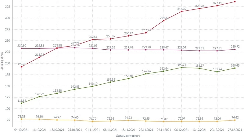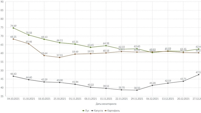 Картофель подешевел на 12 копеек к концу декабря, а белокочанная капуста подорожала на 3 рубля и 84 копейки. Стоимость репчатого лука выросла на 1 рубль и 29 копеек за килограмм. Морковь подорожала на 2 рубля и 56 копеек за отчетную неделю.
