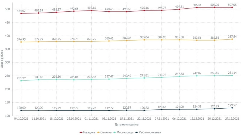 Стоимость говядины в сравнении с предыдущей неделей осталась неизменной — 507 рублей и 5 копеек за килограмм. Цены на свинину выросли на 3 рубля и 98 копеек за это же время. Стоимость килограмма курицы увеличилась на 69 рублей, а мороженая неразделанная рыба подорожала на 3 рубля и 28 копеек.