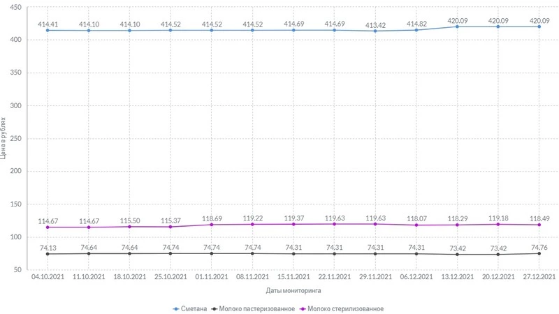 Килограмм сметаны, как и на прошлой неделе, обойдется в 420 рублей и 9 копеек. За весовую единицу творога продавцы запрашивают на 4 рубля и 46 копеек больше, чем неделю назад. Сыр подешевел на 4 рубля и 55 копеек.