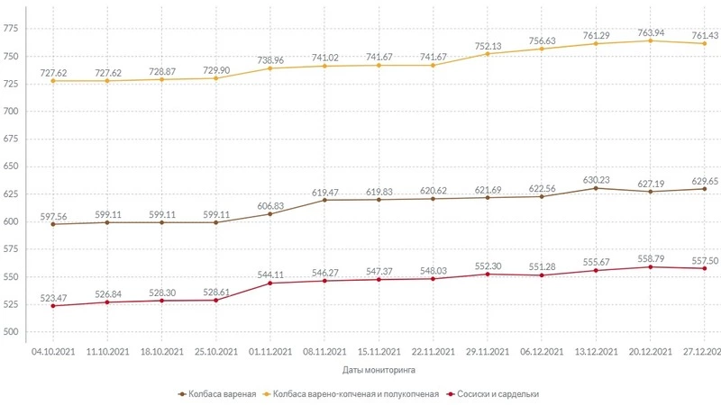 Сосиски и сардельки успели к концу декабря подешеветь на 1 рубль и 29 копеек. При этом полукопченая и варено-копченая колбаса стоит на 2 рубля и 51 копейку меньше. Вареная колбаса подорожала на 2 рубля и 46 копеек в это же время.