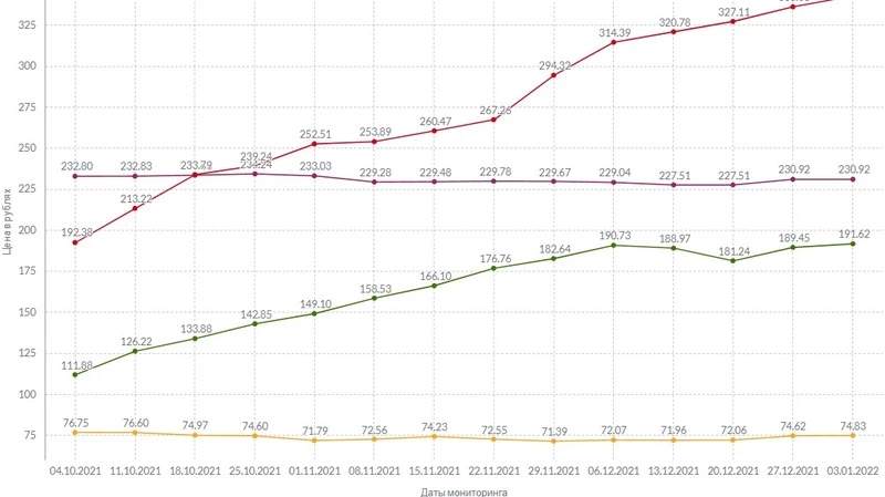 Свежие огурцы продолжают дорожать: цена килограмма выросла на 2 рубля и 17 копеек в последние дни декабря. За аналогичную массовую единицу томатов запрашивают на 6 рублей и 62 копейки больше. Цены на яблоки не изменились: килограмм отдают в среднем за 230 рублей и 92 копейки.