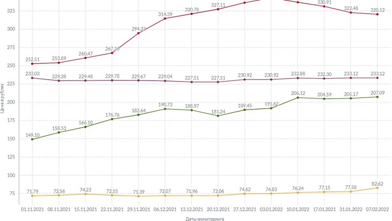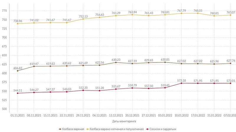 В ассортименте колбасных изделий вновь изменились средние цены на сосиски и сардельки. Прибавка за неделю составила 6 копеек. Полукопченая и варено-копченая колбаса подорожала на 2 рубля и 26 копеек за это же время. Стоимость вареной колбасы выросла на 1 рубль и 80 копеек.