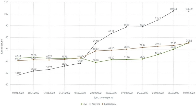 Килограмм картофеля на овощных прилавках подорожал на 2 рубля ровно. Белокочанная капуста тем временем подешевела на 19 копеек. Репчатый лук в сравнении с предыдущей неделей прибавил 5 рублей 57 копеек за неделю, а морковь — 1 рубль и 37 копеек.