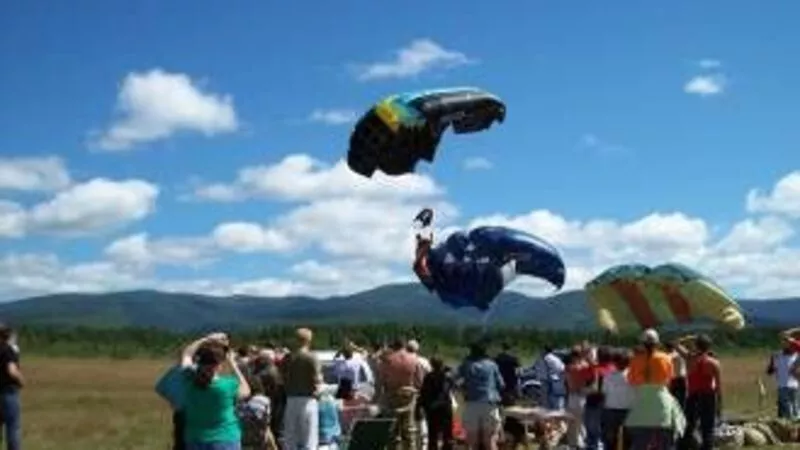 Программу праздника продолжили спортсмены-парашютисты - с государственным флагом России, флагами Сахалинской области, ВВС и РОСТО (ДОСААФ) они выполняют красивейшие пируэты в воздухе и приземляются на землю.