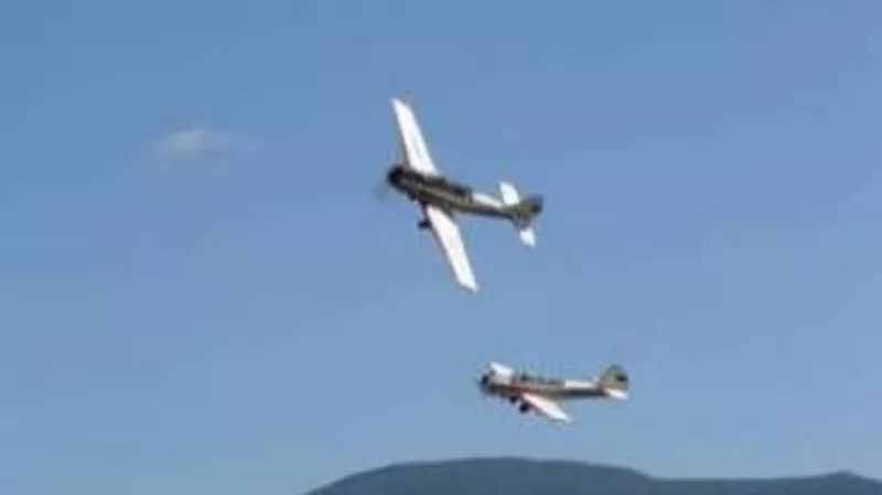 После этого два самолета Як-52 выполняют групповой пилотаж: «петлю», «карту» и «зеркало».
