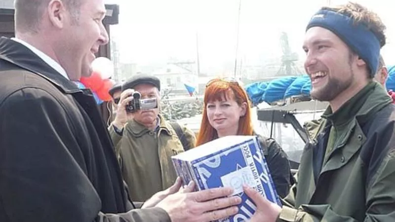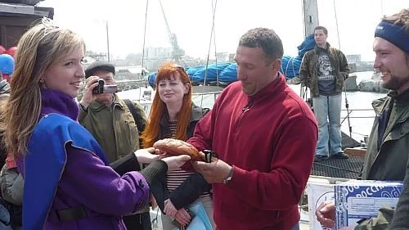 Также с пожеланиями доброго пути каравай капитану судна передала «Мисс Почта России-2009 Сахалинской области» Татьяна Журавлева.