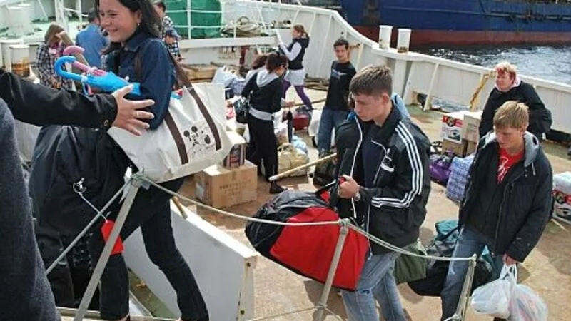 Теплоход «Роза Ругоза» 21 июля доставил в Южно-Курильск 35 подростков - школьников с Итурупа, Шикотана и Кунашира, которые пять дней находились в прибрежных городах японского острова Хоккайдо - Раусу, Немуро, Сибецу, Накасибецу, Бецукай.