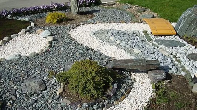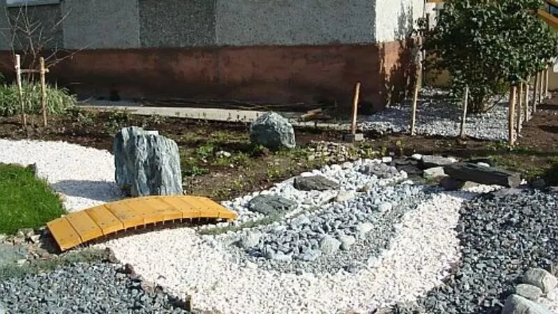 При создании сада были использованы камни, щебенка и мраморная крошка. «Последняя была выложена в виде речки. В следующем году я планирую покрасить мрамор в голубой цвет. Многие камни я лично привез с морских побережий», - рассказал О. Бельский.