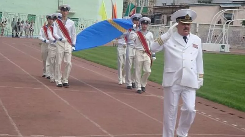 На зеленое поле его внесли курсанты высшего мореходного училища и учащиеся морского профильного класса средней общеобразовательной школы №8 во главе с преподавателем и куратором холмской «мореходки», ветераном войны и Тихоокеанского флота Олегом Яненко.