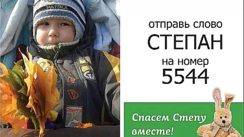 Чтобы помочь ребенку, необходимо отправить на номер 5544 слово СТЕПАН. Стоимость SMS - 30 руб. Все собранные средства будут перечислены на банковскую карту мамы мальчика.