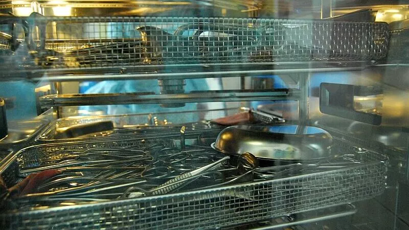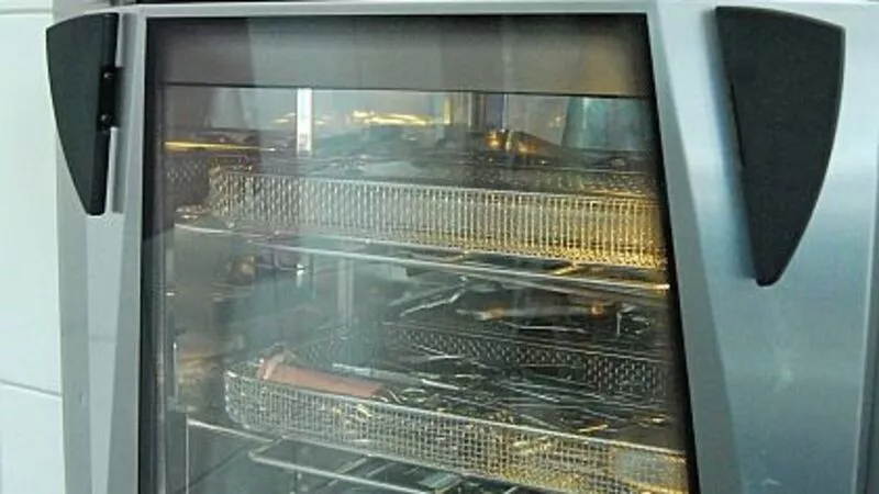 Сам процесс стерилизации выглядит следующим образом: сначала инструментарий поступает в раковины, где загрязнения снимаются механическим способом при помощи пневматического пистолета с водонапорной струей. Затем – в ультразвуковую камеру, она предназначена для инструментов с сильным загрязнением, например, с запекшейся кровью.