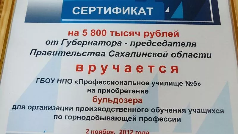В прошлом году Горнозаводское училище отметило 60-летие, и в качестве подарка глава региона вручил юбилярам сертификат на сумму 5 млн. 800 тыс. рублей для приобретения бульдозера. И вот новая техника закуплена и доставлена. По словам Н. Макаровой, это бульдозер самой новейшей модели фирмы «Komatsu».