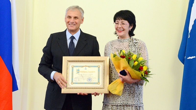 Также сегодня была вручена Почетная грамота Сахалинской области начальнику управления коренных народов Севера аппарата губернатора и правительства региона Екатерине Королевой - за большой вклад в решение вопросов социально-экономического развития этносов, традиционного образа жизни, традиционной культуры и хозяйственной деятельности.