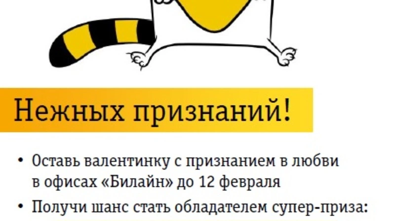 До 12 февраля все абоненты мобильной связи «Билайн» и пользователи услуг домашнего интернета «Билайн» приглашаются к участию в ежегодной акции «Признание в любви». Для этого необходимо подготовить самую романтичную валентинку и принести ее в офис продаж «Билайн». Принимаются валентинки любого формата: признание в виде стихотворения, открытка, сделанная собственными руками, или просто красиво оформленное полосатое сердечко.