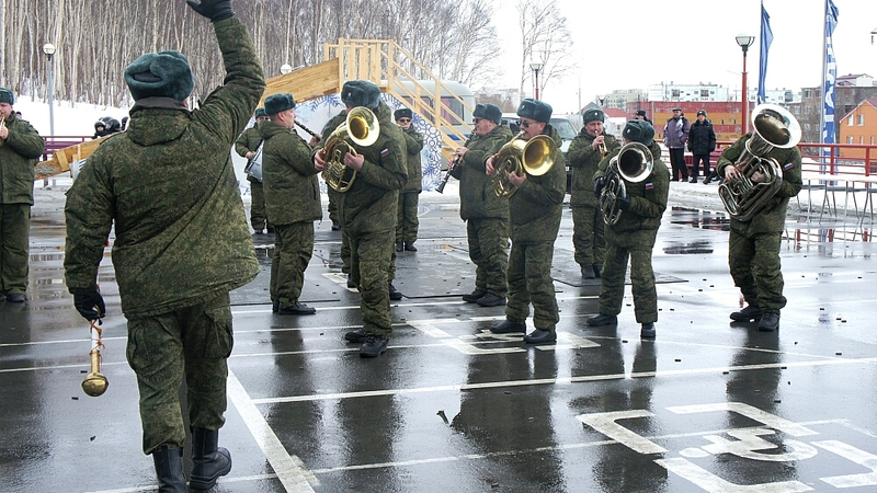 Не менее зрелищным стало выступление духового оркестра Южно-Сахалинского военного гарнизона. Живые музыкальные ритмы поддержали бойцов и подняли настроение всем собравшимся у дворца спорта «Кристалл».