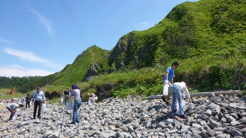 Японская делегация в рамках безвизовых обменов посетила Кунашир. Специалисты-экологи и другие граждане собрали мусор на определенной территории побережья Охотского моря.