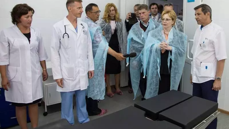 Федеральный министр здравоохранения и глава региона внимательно слушают рассказ главврача, задают вопросы, успевают побеседовать с врачами, медсестрами.