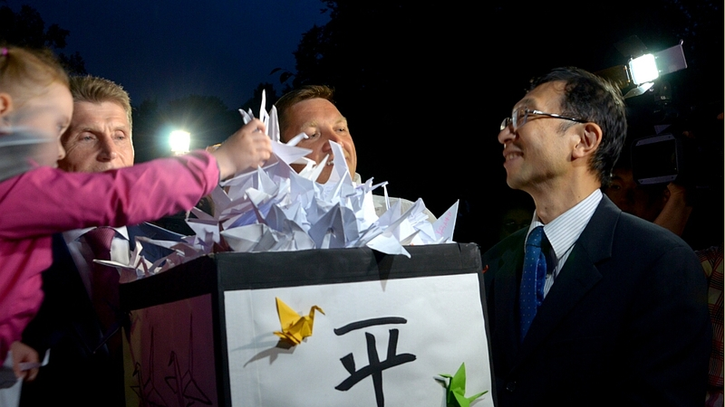 Сотни молодых людей и детей возложили цветы у плаката и зажгли свечи. Сотни маленьких огоньков присоединились к тем миллионам лампад в Японии, которые зажигают в память о бесчисленных жертвах бессмысленных бомбардировок в далеком 1945 году.