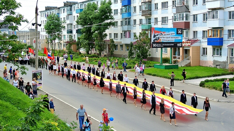 Затем с центральной площади города началось шествие к скверу на улице Героев, где расположена братская могила погибших при освобождении города воинов. Во главу колонны встали барабанщицы детской школы искусств. А следом учащиеся школ несли большую муаровую ленту «Дальневосточная Победа».