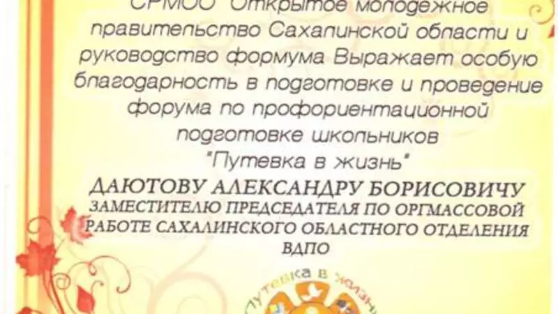 Работникам Сахалинского отделения ВДПО вручены благодарственные письма открытого молодежного правительства Сахалинской области за участие в подготовке и проведении форума по профориентационной подготовке школьников «Путевка в жизнь», сообщает пресс-служба Сахалинского отделения ВДПО.