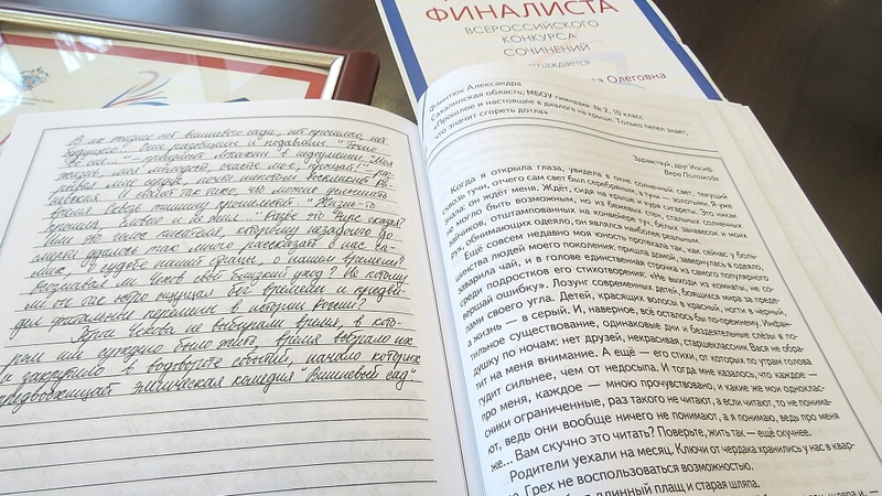 По решению Экспертного совета было отмечено сто лучших сочинений. В их число вошли и плоды вдохновения островных школьников: ученицы десятого класса гимназии № 2 Южно-Сахалинска Александры Флинтюк и пятиклассника школы села Буюклы Смирныховского района Никиты Гнеушева. Их опубликовали в итоговом сборнике работ победителей, изданном по результатам состязания.